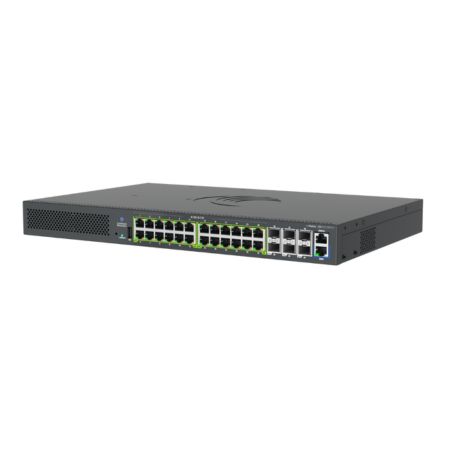 Przepustowość 128 Gbps, 24 porty 10/100/1000 Mbps, 12 portow 4PPoE (60 W) i 12 portów PoE+ (30 W), 4 porty Uplink SFP+, wdrożenie zero-touch, Policy Based Automation.