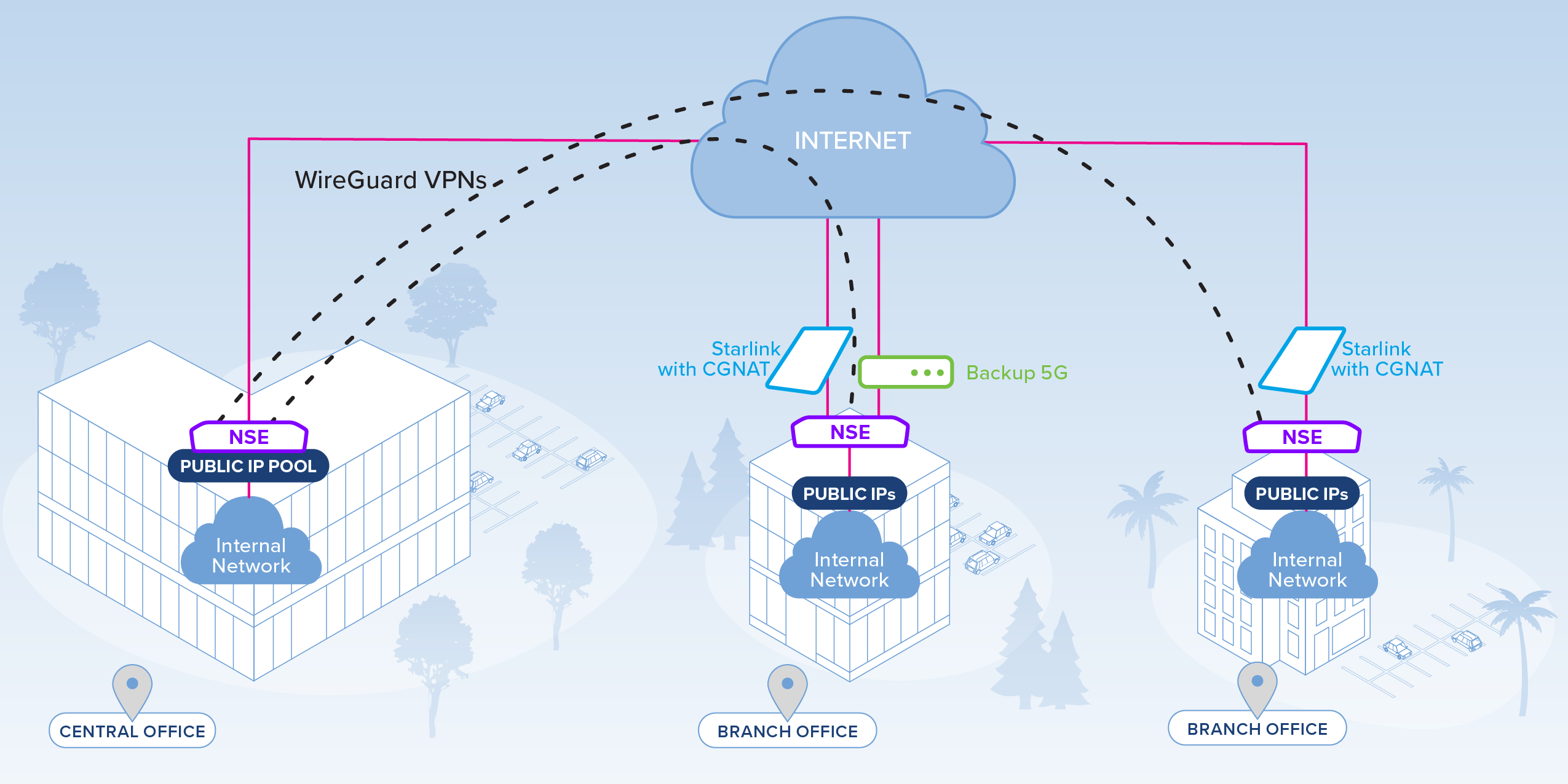 Network Service Edge (NSE) delivers a next-gen firewall and unified threat management (UTM) for organizations requiring a complete security and SD-WAN solution. NSE enables Cambium’s ONE Network, unifying Wi-Fi, switching, security, SD-WAN, wireless backhaul, and fiber in a single, cloud-managed network.